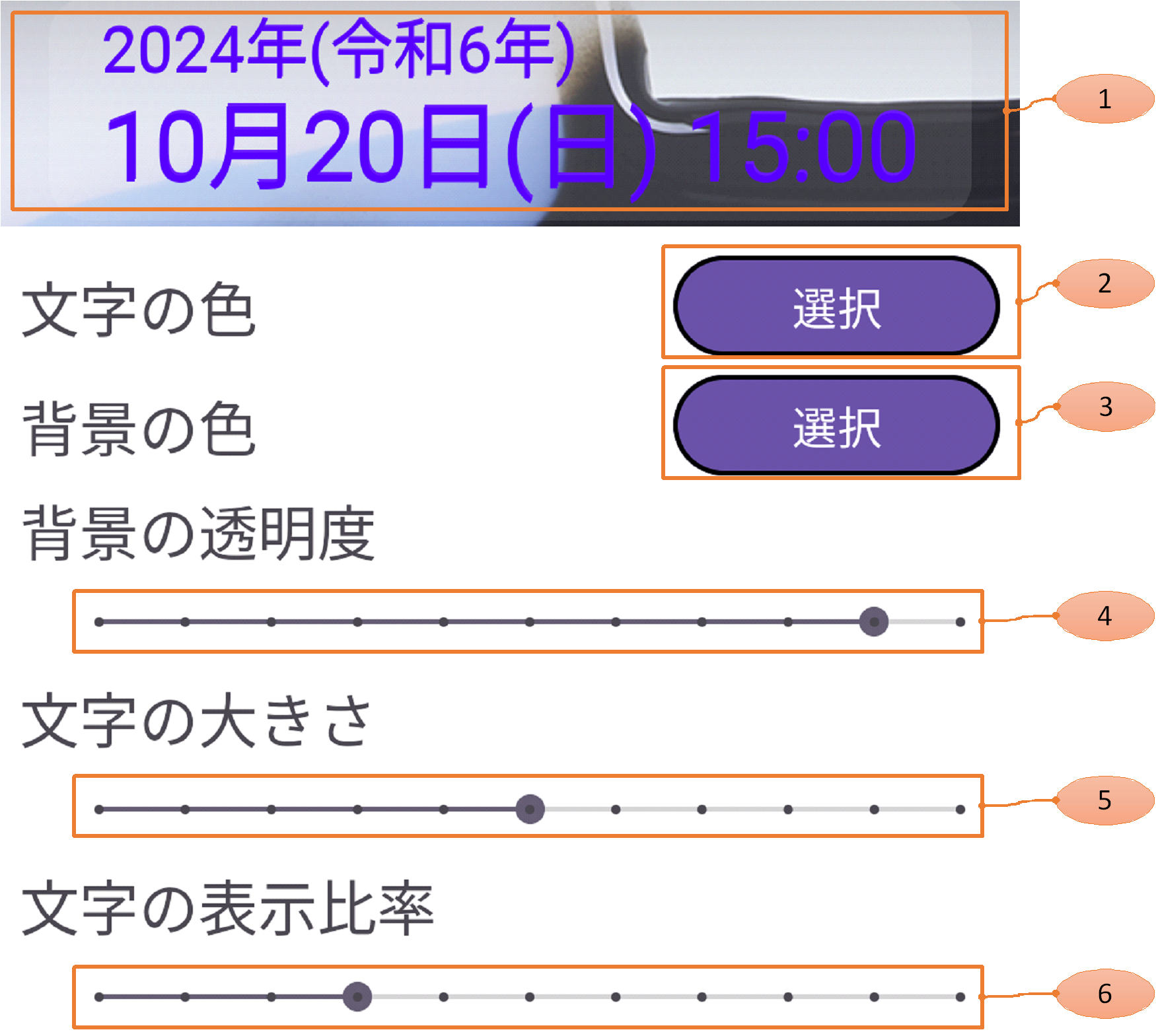 『文字の色』、『背景の色』、『背景の透明度』、『文字の大きさ』、『文字の表示比率』、『書式』、『フォント』の変更に対応しています。